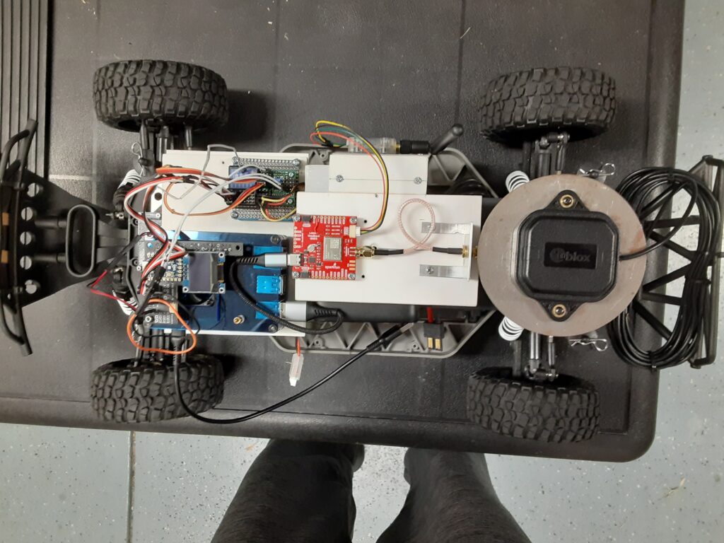 The RC Car Rover Test Vehicle is a Traxxas 1/10 scale Slash Truck chassis that started life as a 2WD BL-2 and was converted to 4WD with a brushless motor/ESC and a 4X4 conversion kit powered by a single 2S 5200mah LiPo battery. The Test Vehicle, for the purpose of this evaluation, also includes a Raspberry Pi 4B+ 4GB SBC, a Donkey Car RC HAT, a u-blox GNSS All-Band High Precision Antenna, a Fly Sky RC Receiver, and an Anker Power Core 13000 Lion battery.
