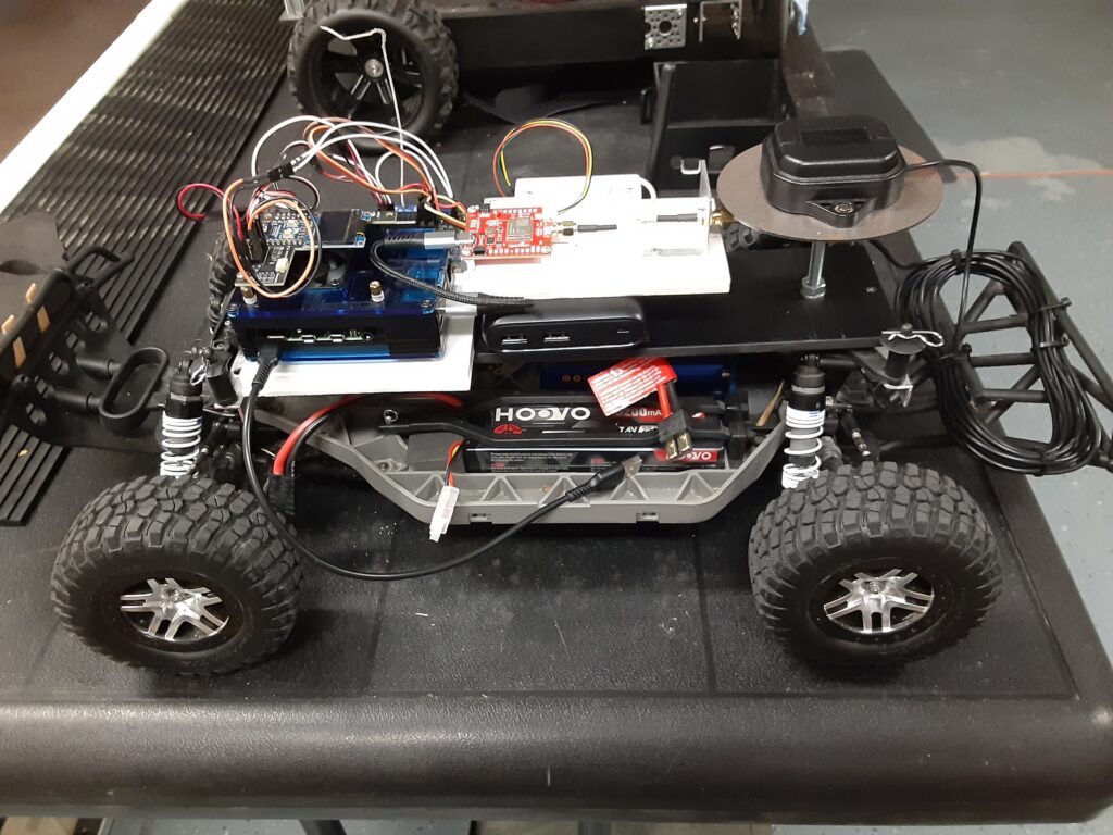 I then mounted the Sparkfun Quadband GNSS RTK Breakout Board and the Micoair LR900-F Telemetry Radio on a sub chassis along with the Raspberry Pi 4B+/RC HAT, the u-blox precision antenna, the RC Receiver and the Anker Power Core 13000 Lion battery as shown in the photos below.