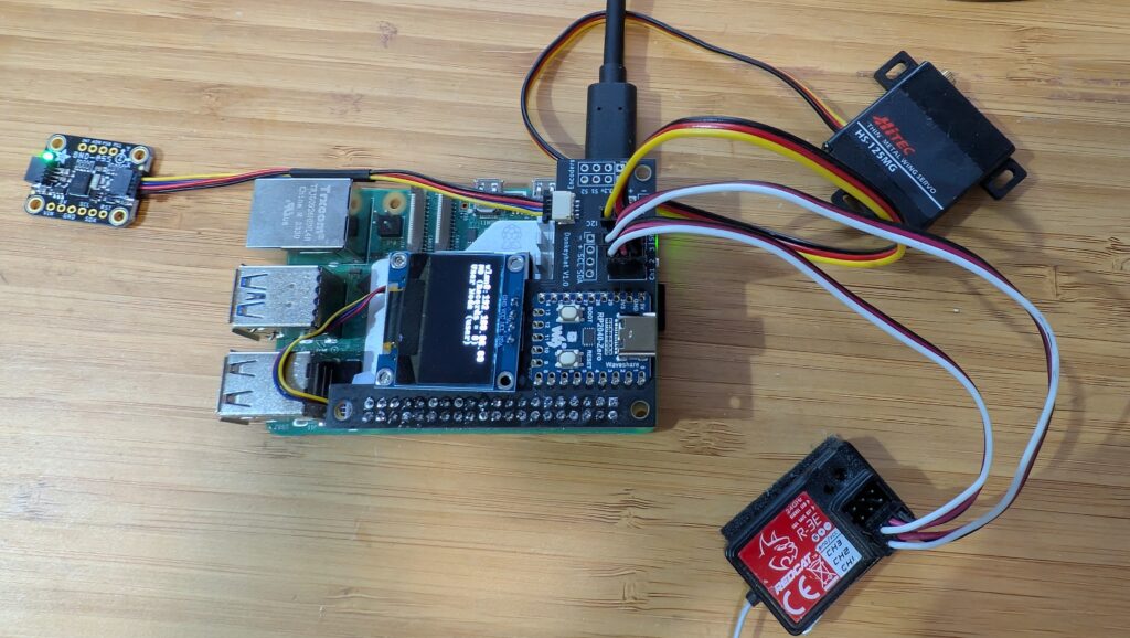 This is the DonkeyCar RC hat, which fits on top of your RaspberryPi and allows you to use the same RC transmitter and receiver that came with your car (assuming you’re using a ready-to-run RC car) or any other regular RC gear. This greatly simplifies your setup, allowing you to avoid having to use a I2C servo driver board and a wireless game controller, while giving far more range than the game controller.